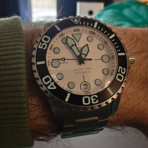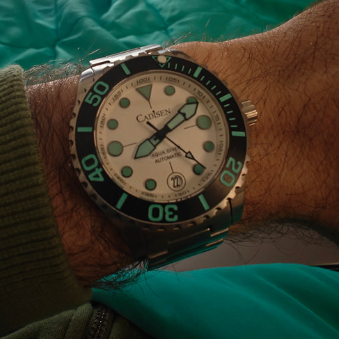 On to the comparison - off the bat, I have to say the Cadisen Aqua diver is going to be the more wearable watch for most people. The 15.5mm height, especially with the stout diameter, gives the Helm a very hefty feel, whereas the Cadisen wears much more like a traditional 40mm dive watch. Dial is going to be subjective - the silver/white of the Cadisen is different from the Matte of the Helm, and they both look good. Lume is no contest, Helm by a mile and the pics will show why. Crystal on the Helm has better clarity and AR coating, but is part of the 15.5mm stack that is the Komodo. I prefer the bezel feel of the Helm, but some may enjoy the fidget factor of the light action of the Cadisen more. Bracelet and clasp again go to the Helm, they are well weighted and balance the heft of the watch head well. The Cadisen is lighter and just doesn’t have the solid feel of the Helm - it's also harder to dial in a good fit with the 3 microadjustments on the clasp. But credit where credit is due, the bracelet is perfectly wearable and the endlinks are solid and there's no rattle.